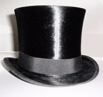 auf dem Kopf einen Zylinder, an den Füßen schwarze Lackschuhe, in der